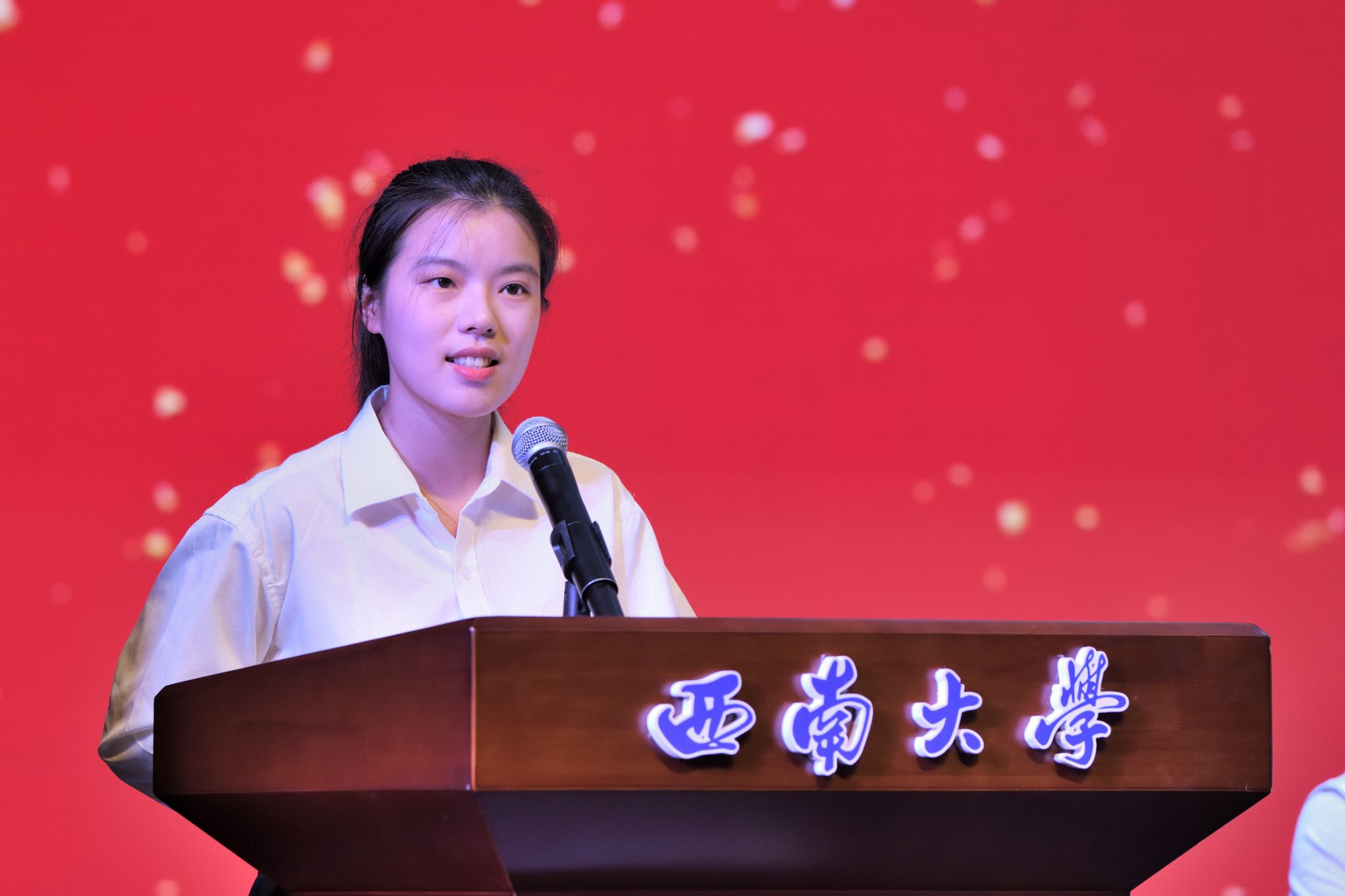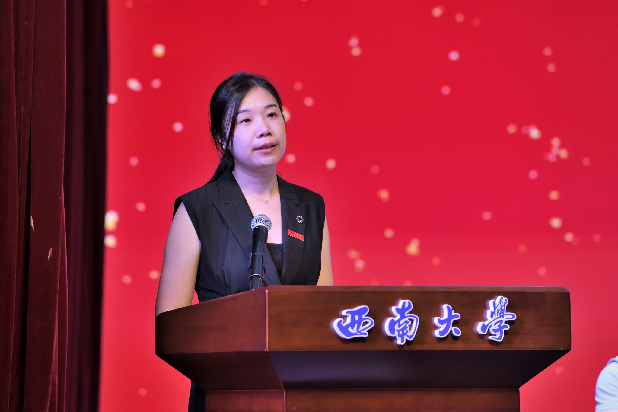 副教授胡嫚作为教师代表发言。她热烈欢迎新生的到来,鼓励大家尽快完成从“被动学习”到“主动学习”的转变,树立明确目标,激发内在动力。她以自身经历告诫同学们,在失败中淬炼的成长是大学里最宝贵的财富,要勇于面对挑战,扎实专业知识,磨炼品格修养,以脚踏实地之姿实现自身理想,书写精彩的大学生活。