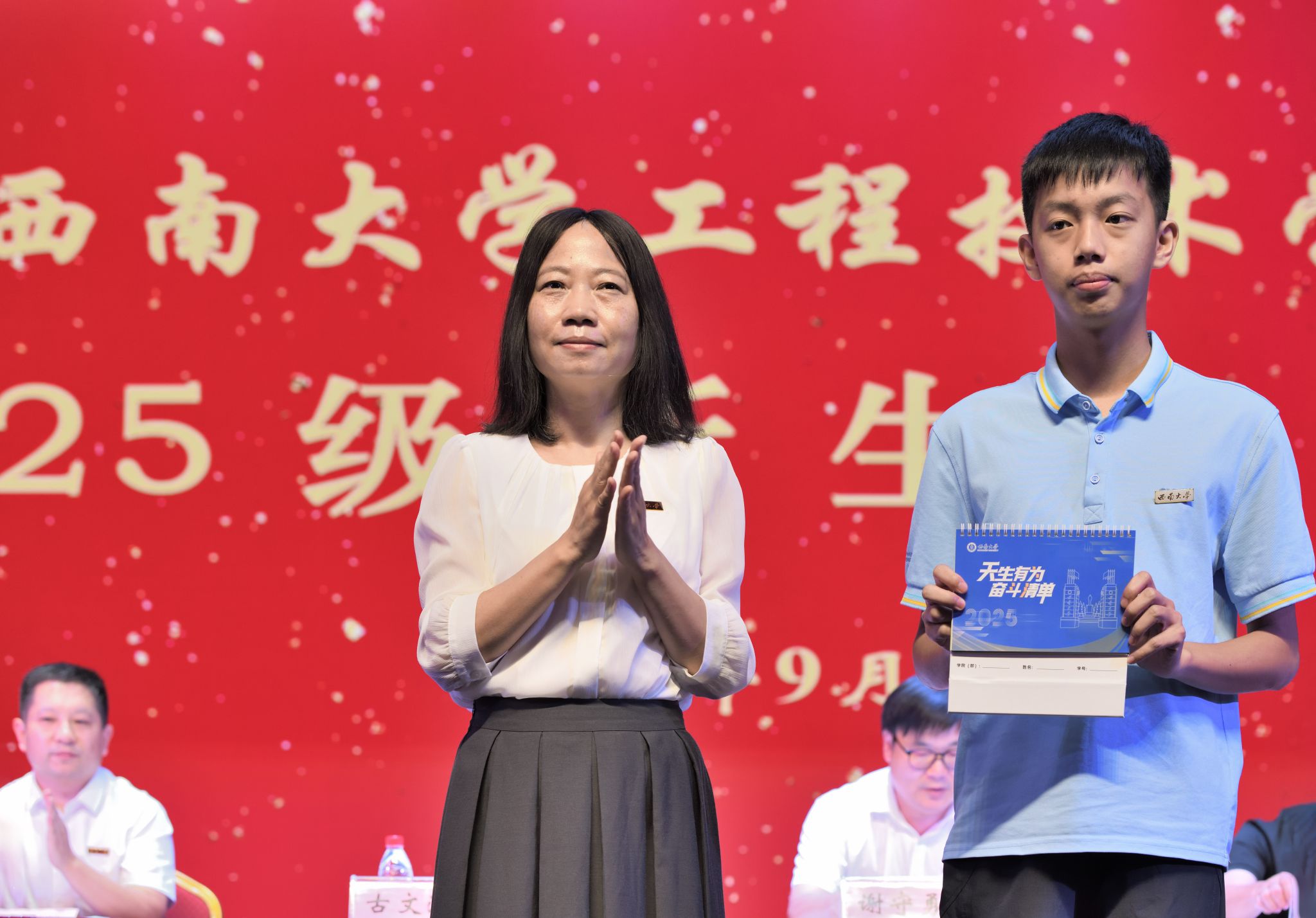 党委书记古文海为新生代表2025级电气工程及其自动化本科生林纪宏颁发奋斗清单。