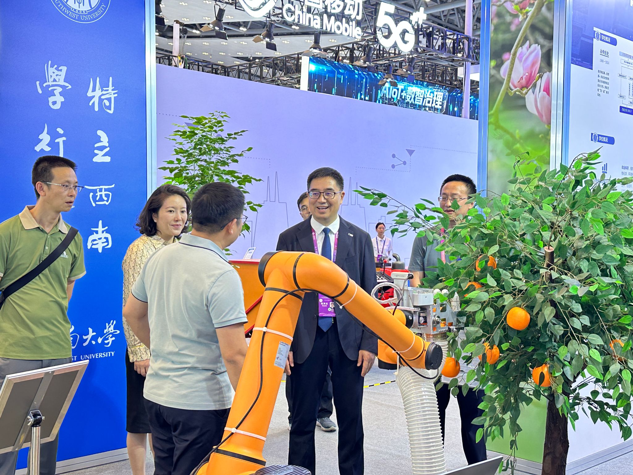 展台考察指导,听取柑橘采摘机器人团队汇报,了解了柑橘采摘机器人的工作原理、技术难点、研发成本及推广应用现状等,并对PG赏金女王